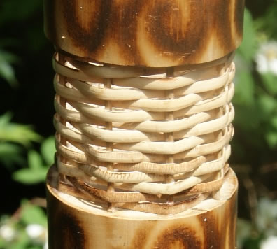 This pleasingly neat little item features five, hollow silver alloy chimes supported by a tube made of tightly woven rattan and two sections of giant bamboo which feature swirling patterns burnt onto the surface.