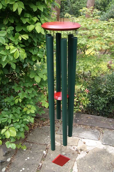 supports 6 metal chimes of an aluminium alloy with a satin green finish. The chimes are strung on heavy duty, coated nylon line.
