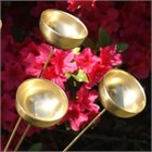 7 thin metal rods each have a golden brass cup at the tip, creating a a unique musical sculpture.  The base of the rods are seated in an artificial (but weighty) stone which blends in nicely with bark chippings, soil or a rock garden.