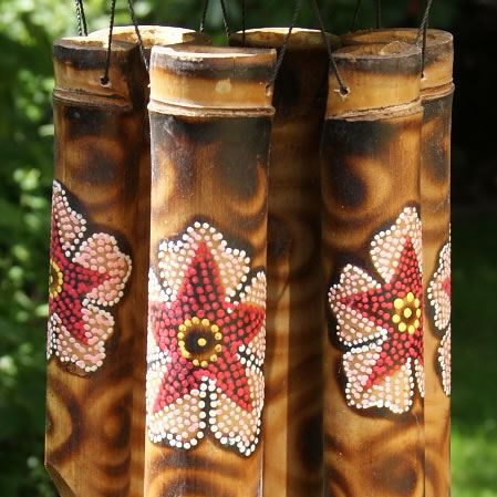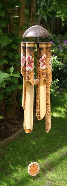 A polished section of coconut shell supports 6 cut bamboo chimes of different lengths with hand-painted flower motif. Strung on sturdy, rot-proof black nylon line.
