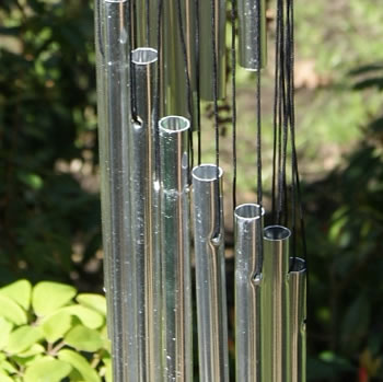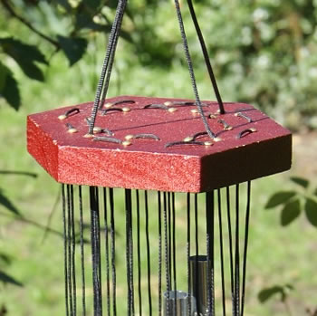 16 hollow, silver alloy chimes are arranged in a spiral below a hexagonal wooden top which is stained mahogany red.