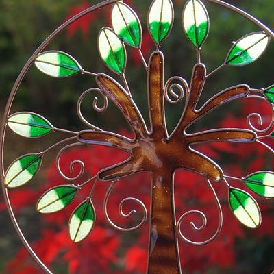 Framed within a copper coloured metal ring, a stylised tree has a glossy, chocolate brown trunk and branches with green resin leaves, all of which